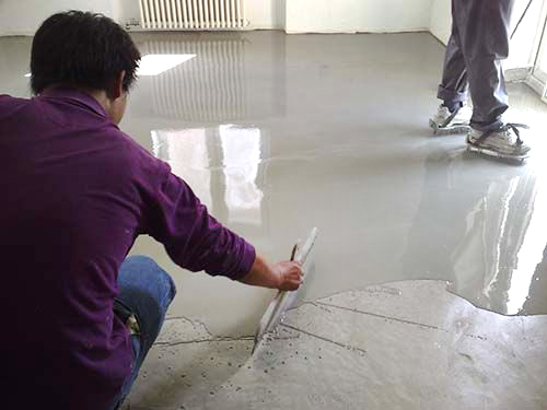 3、水泥自流平面層:將液體添加劑倒入干凈的攪拌容器中,然后按比例一邊 攪拌一邊加入自流平粉料,充分?jǐn)嚢璩蔁o(wú)生粉團(tuán)的、均勻的膠條,用鏝刀將調(diào)配好水泥自流平材料均勻饅涂在底漆上,干燥時(shí)間為24-48小時(shí)化;