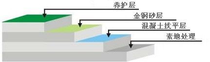3. 金鋼砂層:先將2/3硬化劑(金屬骨料或非金屬骨料)均勻撒布,讓材料充分吸收混凝土中水份,用抹光機械抹平;再將余下1/3硬化劑均勻撒布,抹平。當(dāng)混凝土不被破壞時,再抹平,收光;